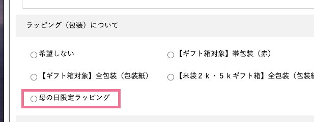 母の日ラッピングをご希望の際は、対象商品をご注文のうえ、ご購入時に「注文備考」の「ラッピング(包装)について」の中にある「母の日限定ラッピング」にチェックのうえご注文ください。
